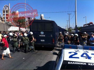 Οι εργαζόμενοι «τρώνε ξύλο για να μπούνε στο εργοστάσιο», αναφέρουν αυτόπτες μάρτυρες που βρίσκονται στο σημείο.