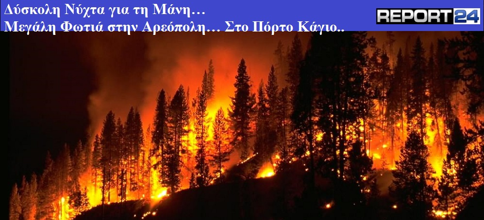 Μεγάλη Φωτιά ξέσπασε λίγο μετά τις 8 το βράδυ της Παρασκευής στην Αρεόπολη και το Πόρτο Κάγιο. Σύμφωνα με τις πληροφορίες του Report24 η φωτιά είναι σε πλήρη εξέλιξη με την ένταση των ανέμων που πνέουν στην περιοχή να δυσχεραίνει κατά πολύ την προσπάθεια κατάσβεσης.