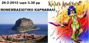 Η Δημοτική Ενότητα Μονεμβασίας σας προσκαλεί και φέτος να συναντηθούμε σε αποκριάτικους ρυθμούς την τελευταία Κυριακή της Αποκριάς ώρα έναρξης 3.30 μμ στη Μονεμβασία