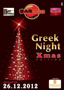 Επίσης την επομένη των Χριστουγέννων την Τετάρτη 26 Δεκεμβρίου δεν θα μπορούσε το αγαπημένο στέκι  Barplace να μην συνεχίσει την παράδοση στις ελληνικές βραδιές που καθιέρωσε στην πόλη.