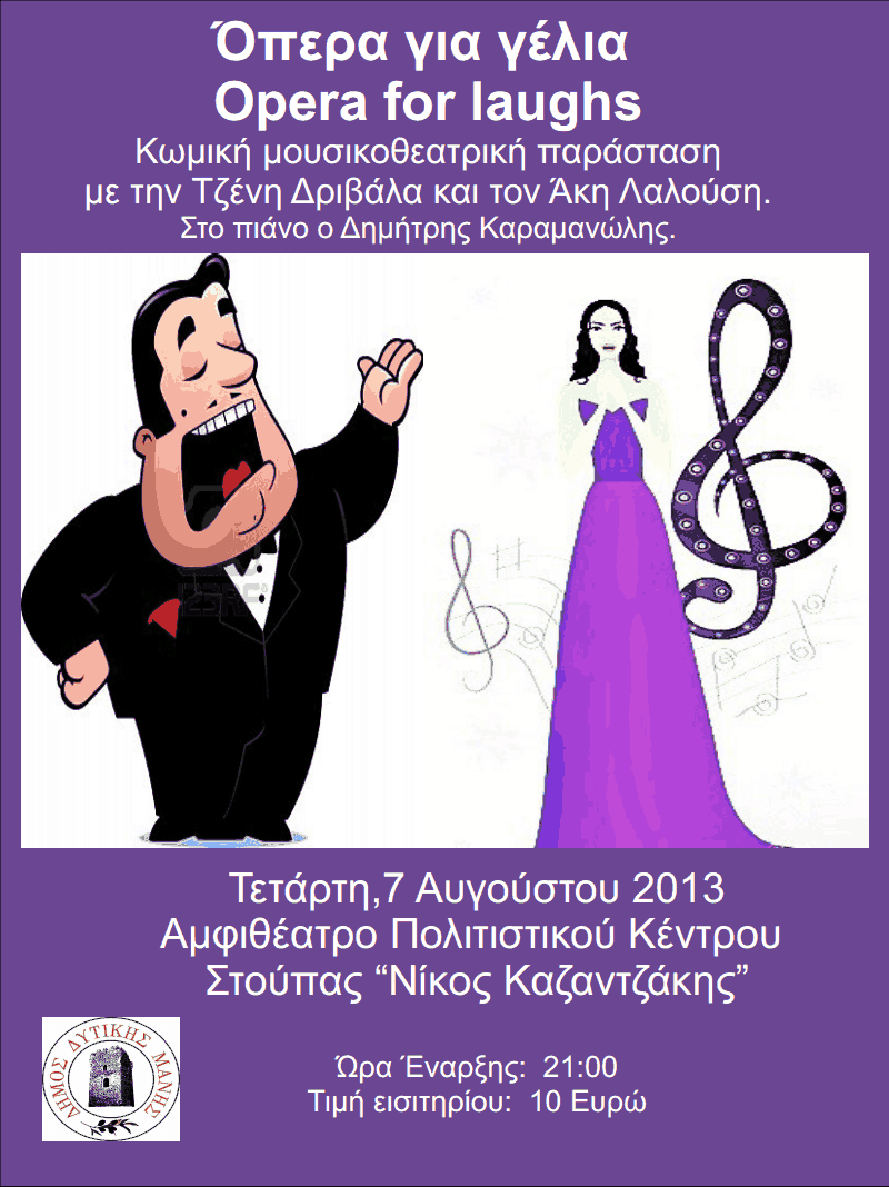 Στο πλαίσιο των πολιτιστικών εκδηλώσεων του Δήμου Δυτικής Μάνης για το Καλοκαίρι 2013, θα παρουσιαστεί η Μουσική Θεατρική Παράσταση ΟΠΕΡΑ ΓΙΑ…ΓΕΛΙΑ, την Τετάρτη 7 Αυγούστου 2013 και ώρα 21.00, στο Πνευματικό Κέντρο της Στούπας.