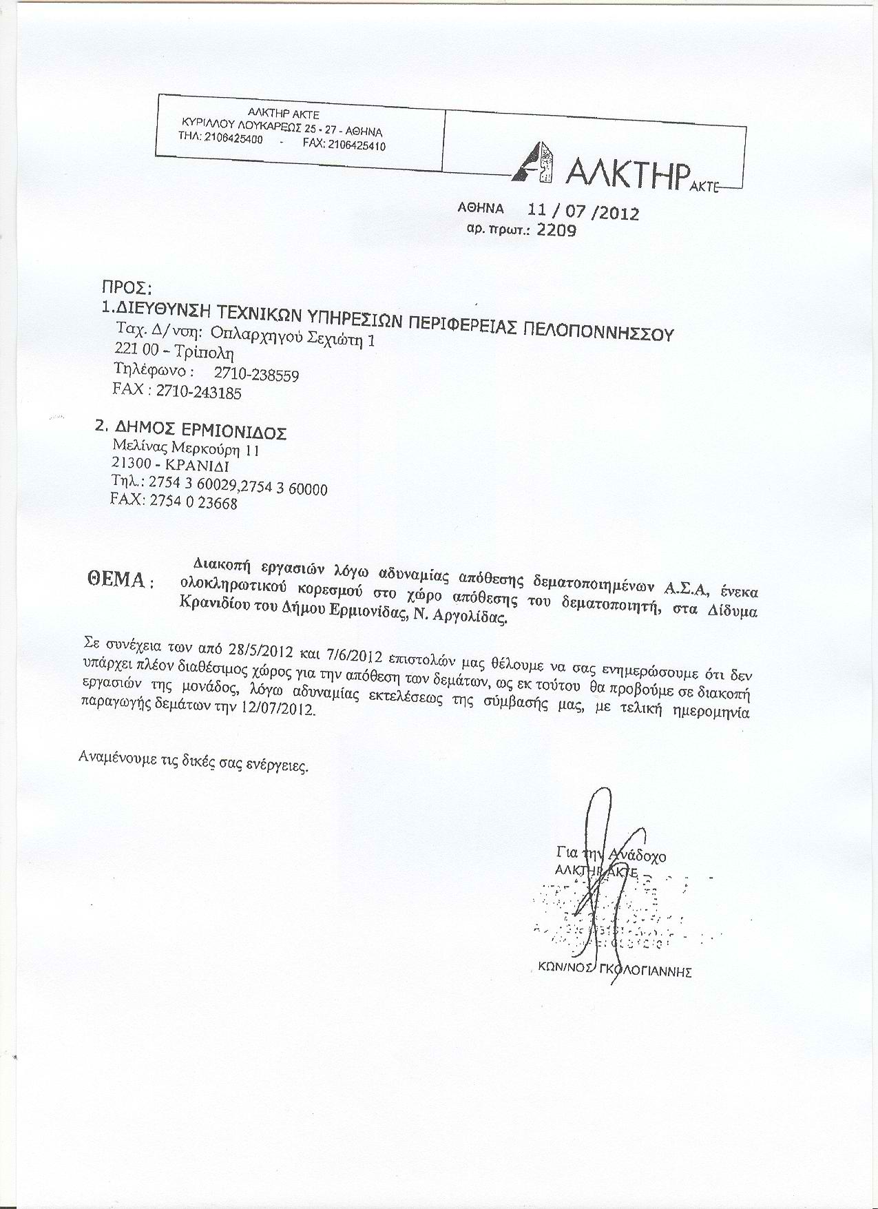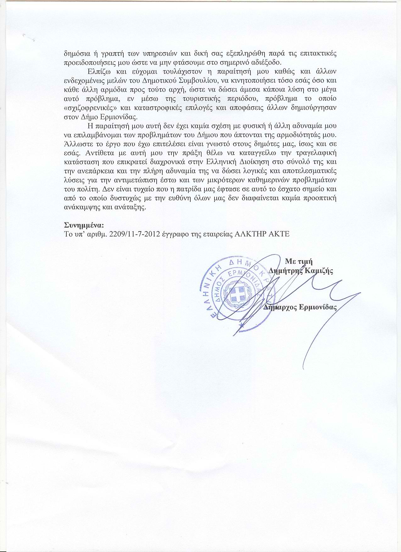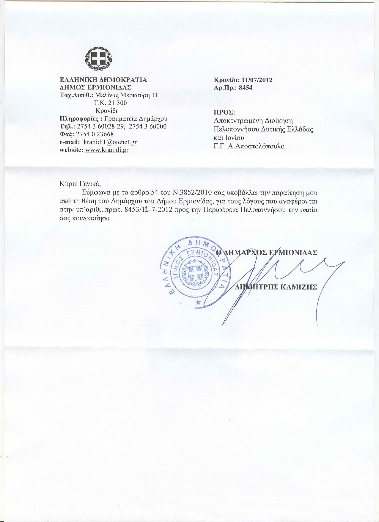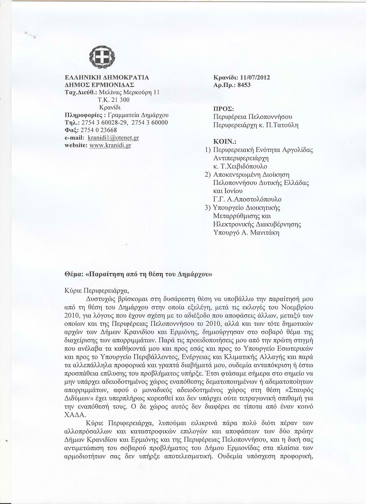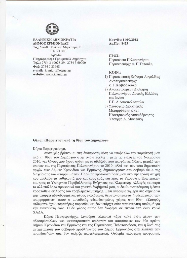 «Καμία υπόσχεση ή διαβεβαίωση δική σας ή των υπηρεσιών σας δεν εκπληρώθηκε μέχρι σήμερα», κλείνει την επιστολή του ο παραιτηθείς Δήμαρχος Ερμιονίδας.