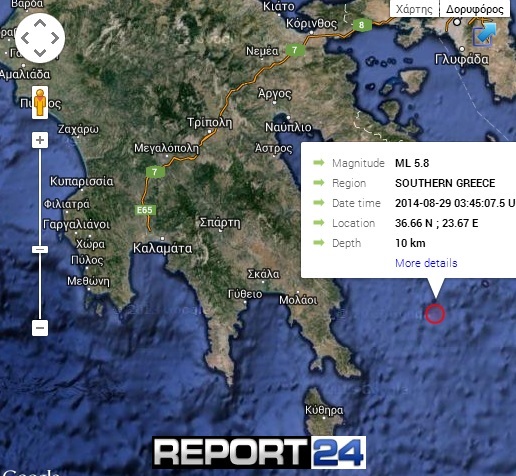 Ανατολικά της Σπάρτη ο Σεισμός που έγινε πρίν απο λίγα λεπτά μεγέθους 5.8 της κλίμακας ρίχτερ. Επίκεντρο ανάμεσα της Λακωνίας και της Μύλου σε υποθαλάσσια περιοχή και μεγάλο εστιακό βάθος. Η Σπάρτη ξύπνησε με τον σεισμό αλλά στην πόλη δεν έχουν παρατηρηθεί προβλήματα.