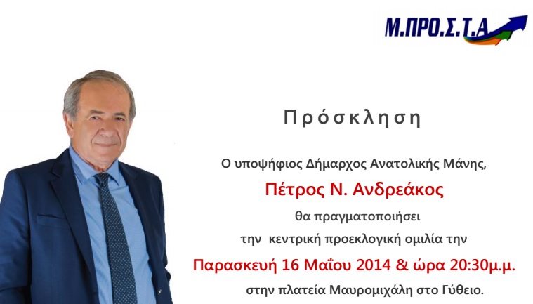 Ο υποψήφιος Δήμαρχος Ανατολικής Μάνης, κ. Πέτρος Ν. Ανδρεάκος, επικεφαλής του Δημοτικού Συνδυασμού Μ.ΠΡΟ.Σ.Τ.Α. σας καλεί στην κεντρική προεκλογική ομιλία του, την Παρασκευή 16 Μαΐου 2014 και ώρα 20:30 στο Γύθειο, στην κεντρική πλατεία Μαυρομιχάλη.