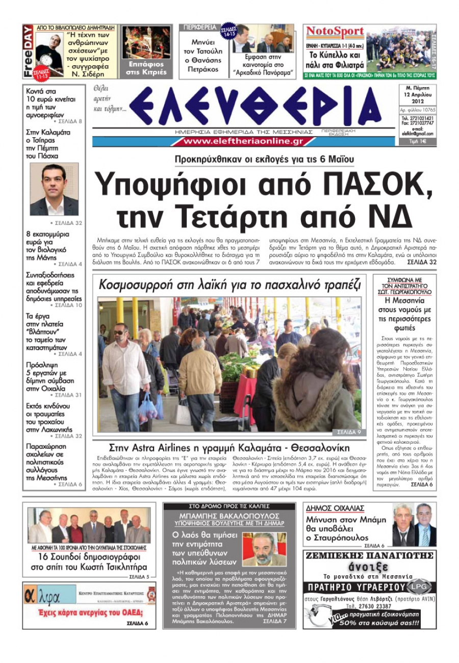 Το πρωτοσέλιδο απο την Ελευθερία Μεσσηνίας 12 Απριλίου 2012