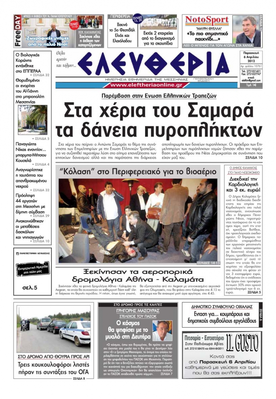 Το πρωτοσέλιδο απο την Ελέυθερία Μεσσηνίας 6 Απριλίου 2012