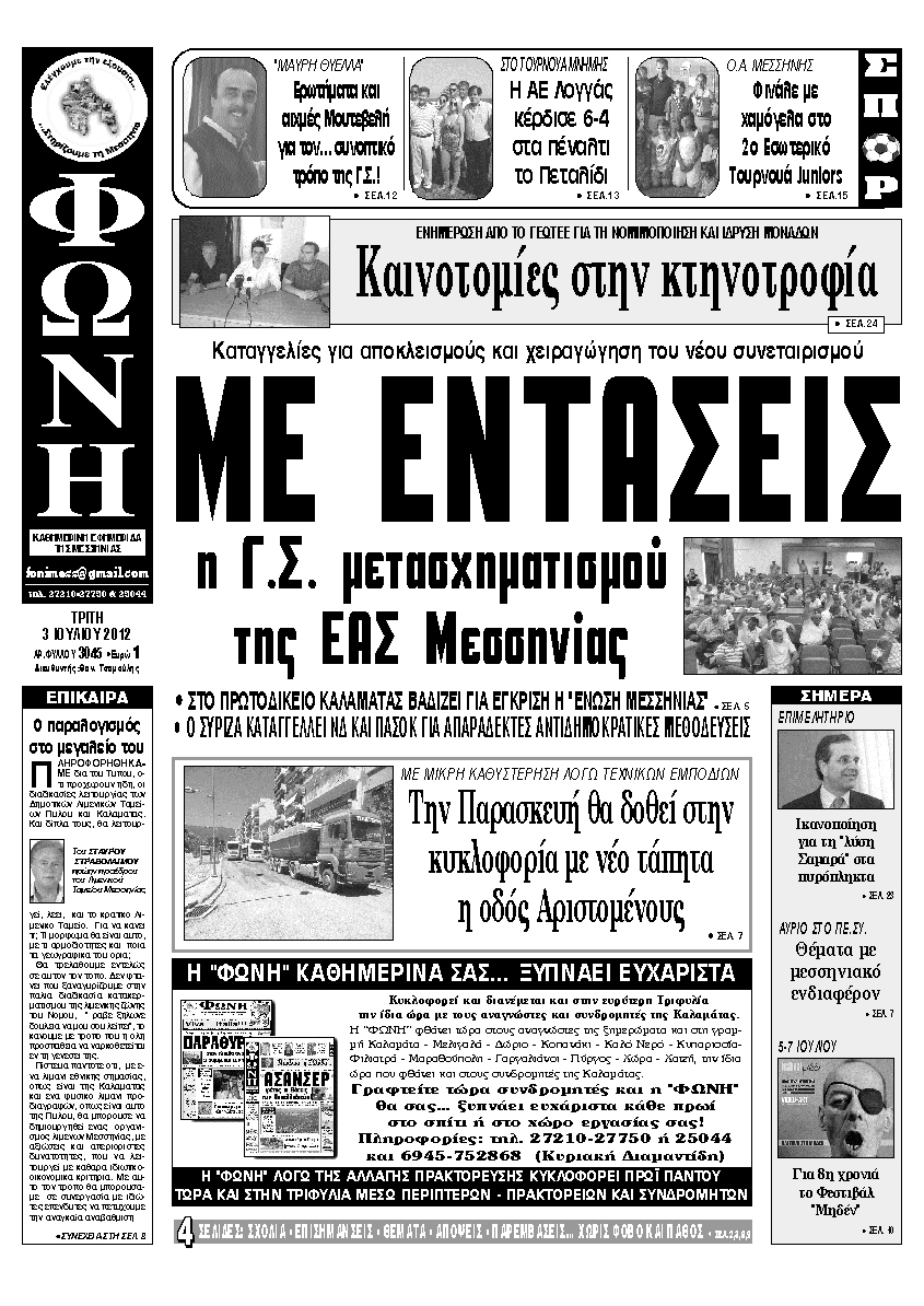 Το πρωτοσέλιδο απο την Φωνή Μεσσηνίας 3 Ιουλίου 2012