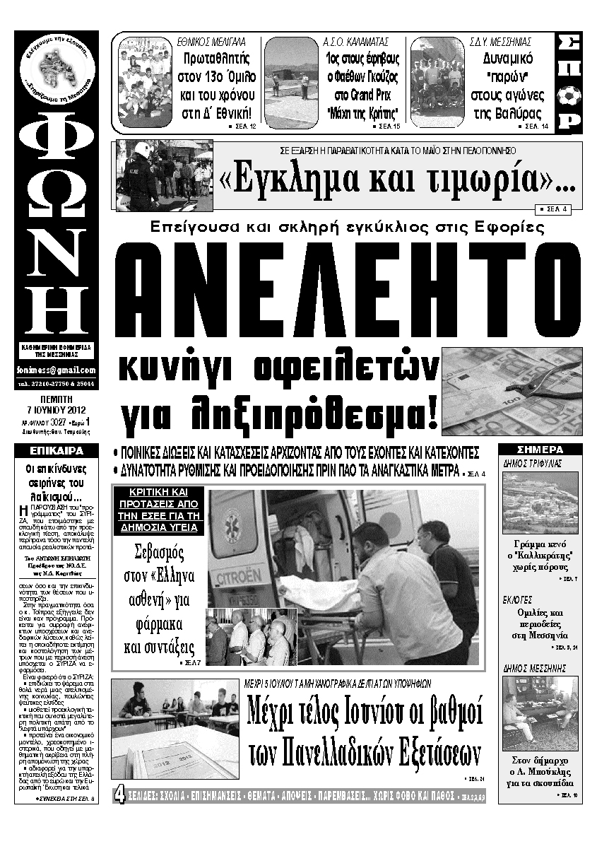 Το πρωτοσέλιδο απο την Φωνή Μεσσηνίας 7 Ιουνίου 2012