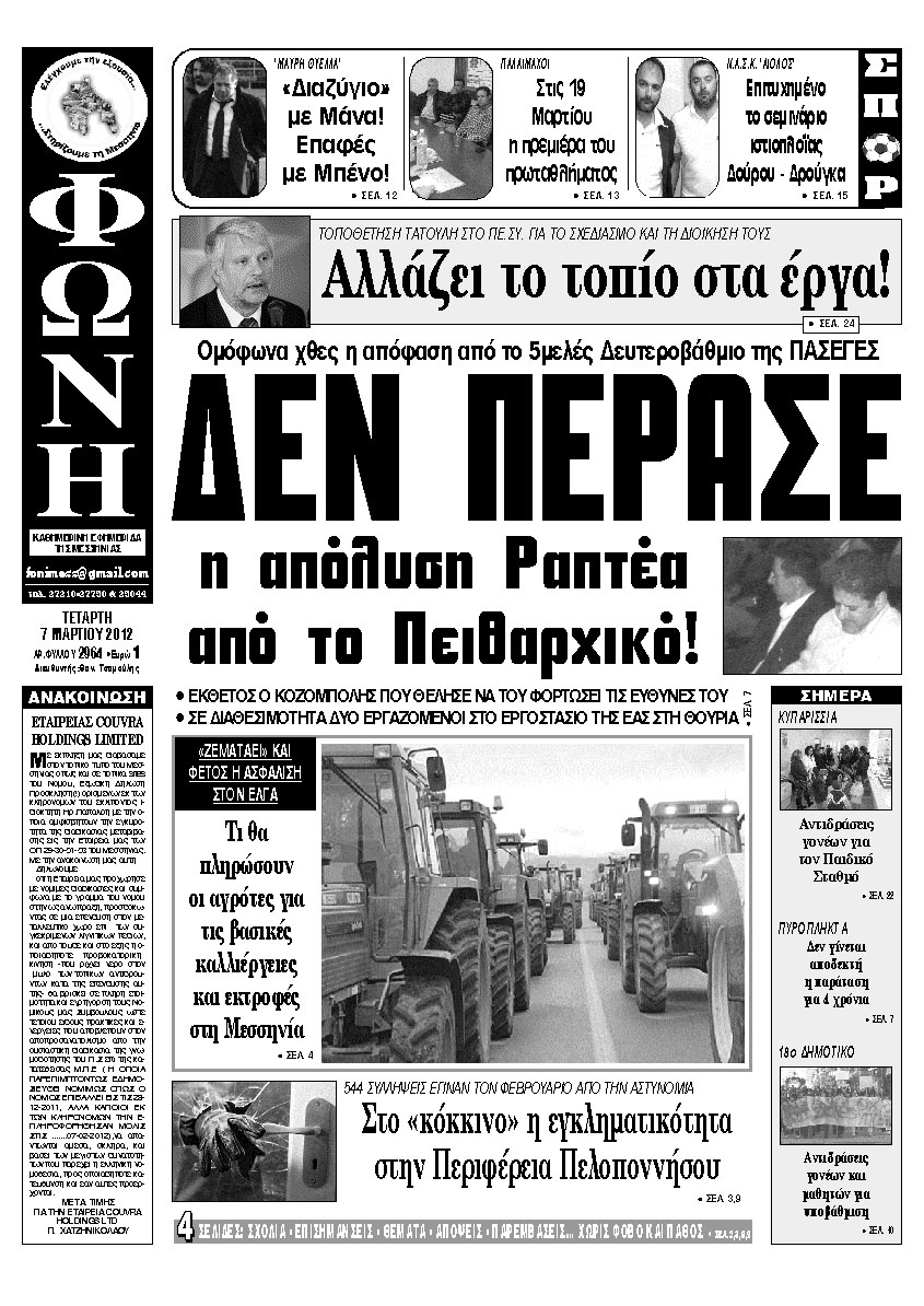 Το πρωτοσέλιδο απο την Φωνή Μεσσηνίας 7 Μαρτίου 2012